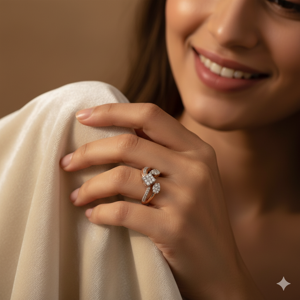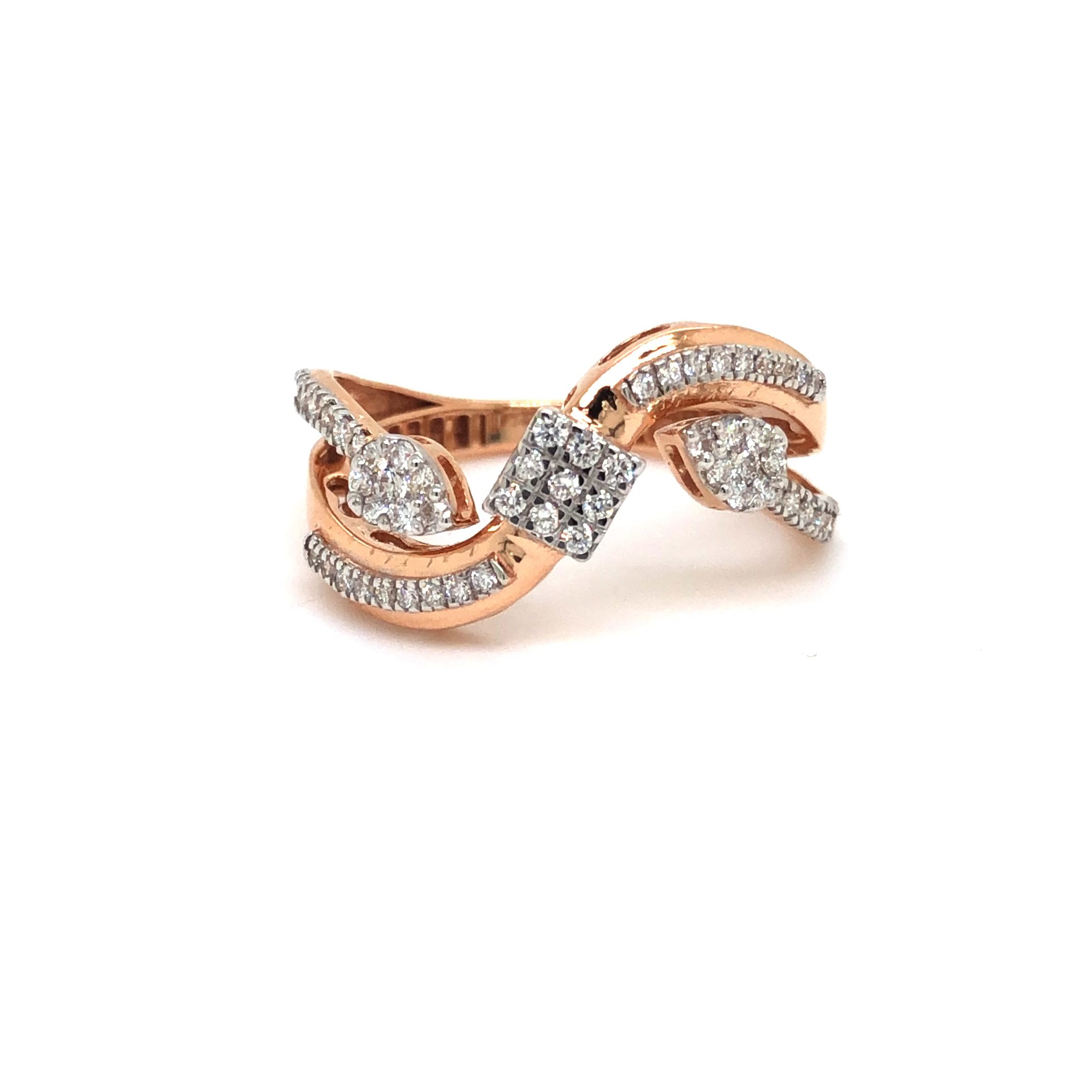 The “Infinity Cascade” ring showcases a breathtaking fluid design that embodies endless elegance. This masterpiece features three distinct diamond formations artfully arranged along intertwining rose gold bands: a striking square diamond cluster at the center, flanked by two teardrop-shaped diamond clusters that create perfect balance and flow.