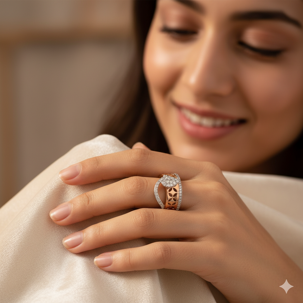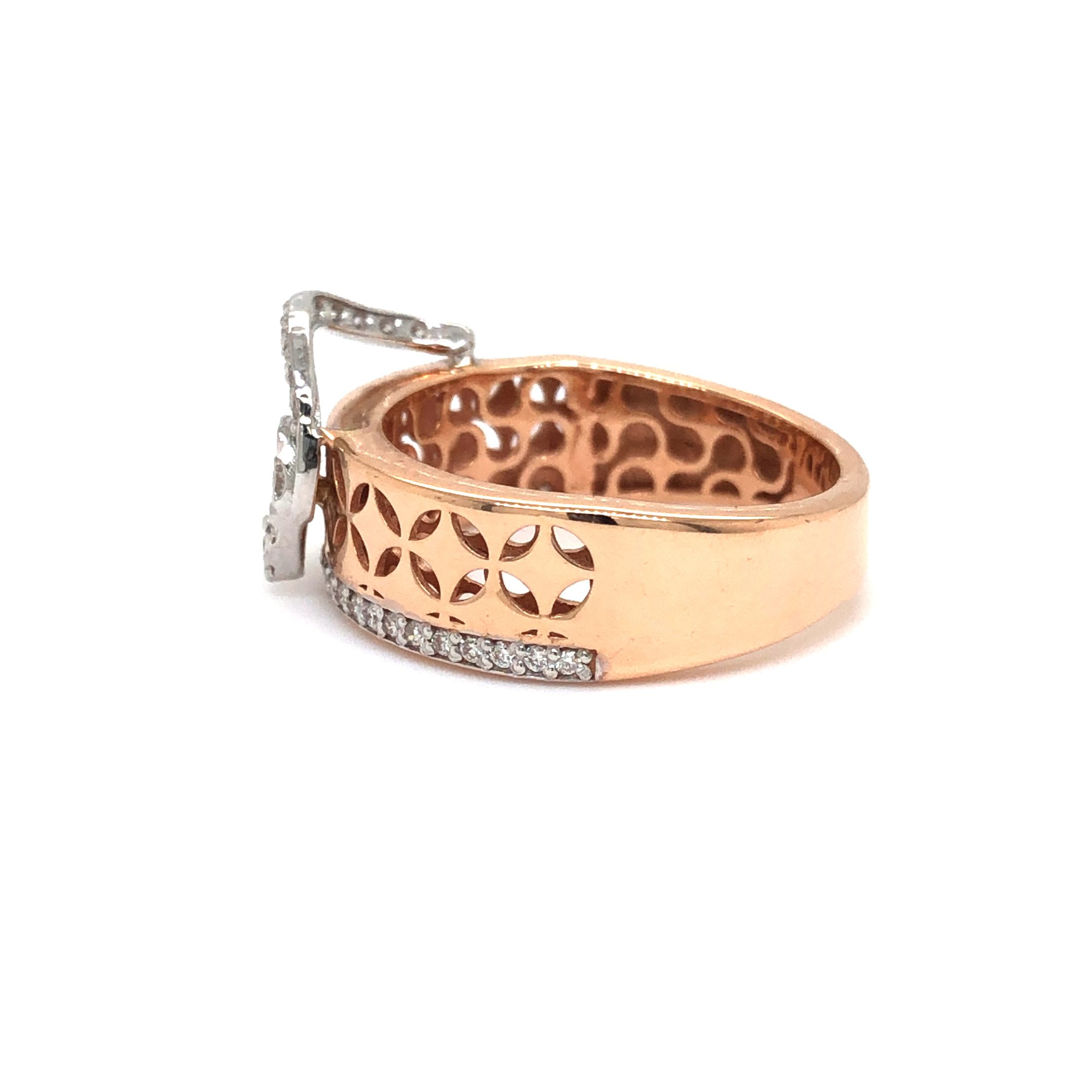 The sleek and symmetrical cutwork design offers a perfect blend of traditional artistry and modern sophistication, while the curved diamond-encrusted swirl enhances its feminine charm. Whether worn daily or on special occasions, this ring radiates grace and glamour.