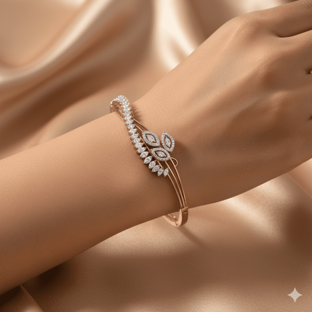 Delicately designed for the modern muse, the “Petal Grace” Diamond Bracelet in 14K rose gold (8.190 grams) captures nature’s beauty with its flowing vine and leaf motif. Set with 107 natural EF-VVS diamonds totaling 0.61 carats, this bracelet shines with elegance and feminine charm. The sleek lines and intricate petal arrangement make it a perfect statement piece for special events or graceful everyday luxury.
