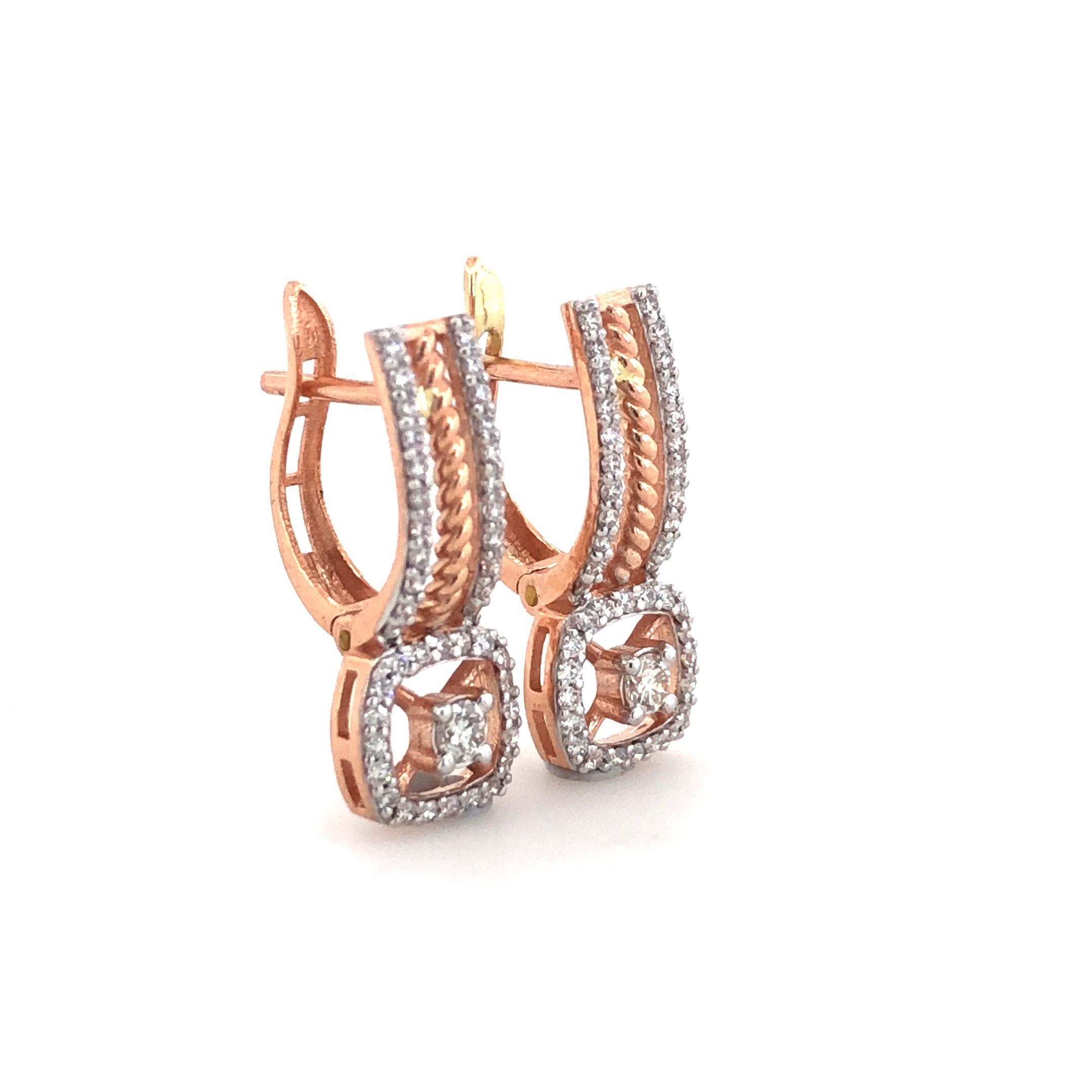 These elegant drop earrings feature a distinctive chain-link design within a geometric frame, adorned with 86 natural diamonds totaling 0.41 carats. Crafted in beautiful 14K rose gold , the diamonds boast an exceptional EF-VVS quality, ensuring brilliant sparkle and clarity. Perfect for adding a sophisticated and modern touch to any outfit, these natural diamond earrings are ideal for special occasions or as a luxurious statement piece.