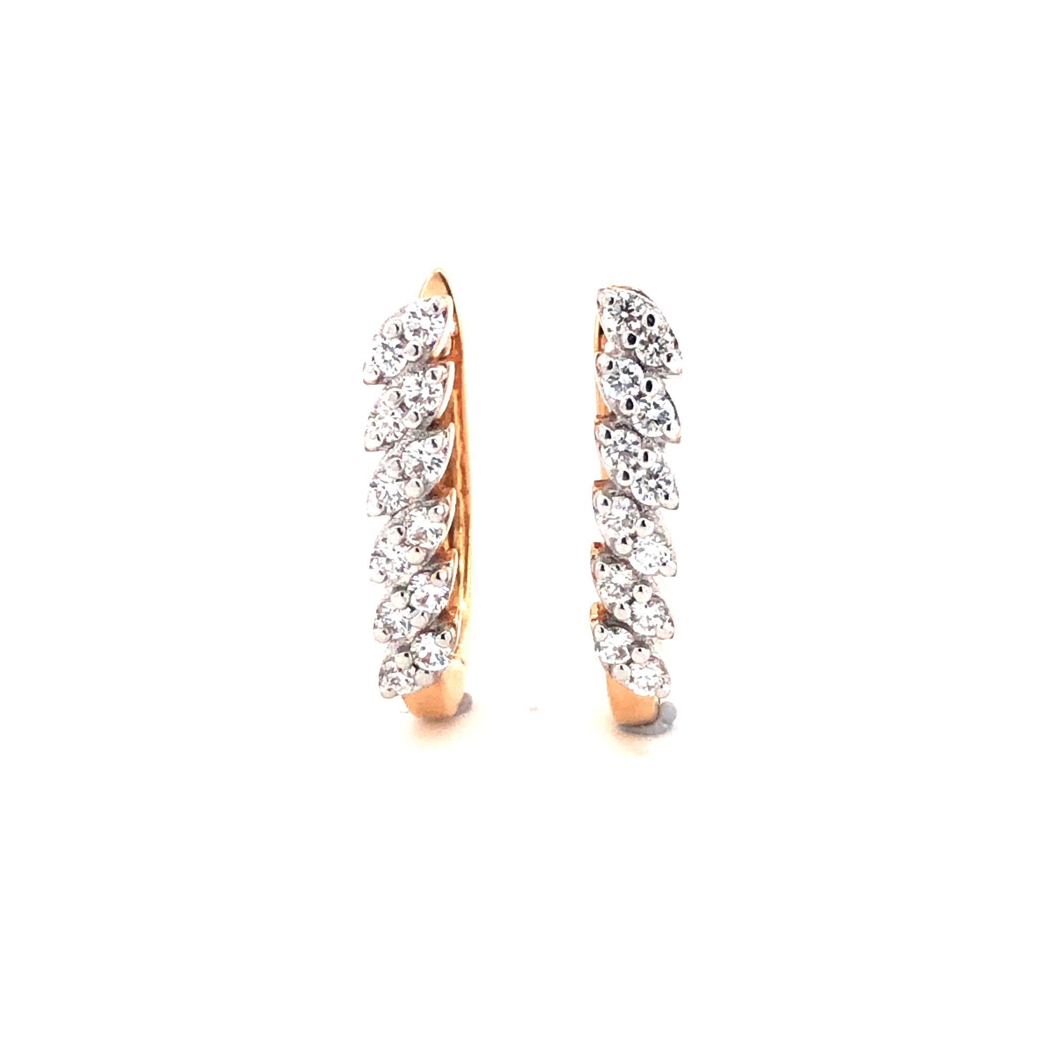 Delicate, dazzling, and distinct — these 14K Rose Gold Leaf Motif Diamond Earrings are the epitome of refined luxury. Crafted with 24 natural EF-VVS quality diamonds totaling 0.32 carats, each stone is expertly set in a shimmering marquise-inspired design that hugs your earlobe gracefully. With a gold weight of 2.540 grams, these lightweight huggie earrings strike the perfect balance between comfort and statement styling.
