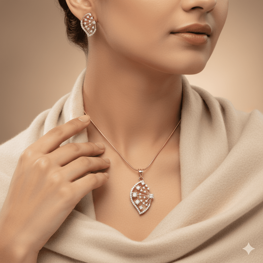 The “Sunburst Fan” pendant and earring set showcases exceptional craftsmanship with its distinctive art deco-inspired design. This luxurious set features a stunning fan-shaped pendant and matching earrings, each adorned with meticulously arranged premium diamonds in an elegant radiating pattern reminiscent of a folding fan or sunburst.