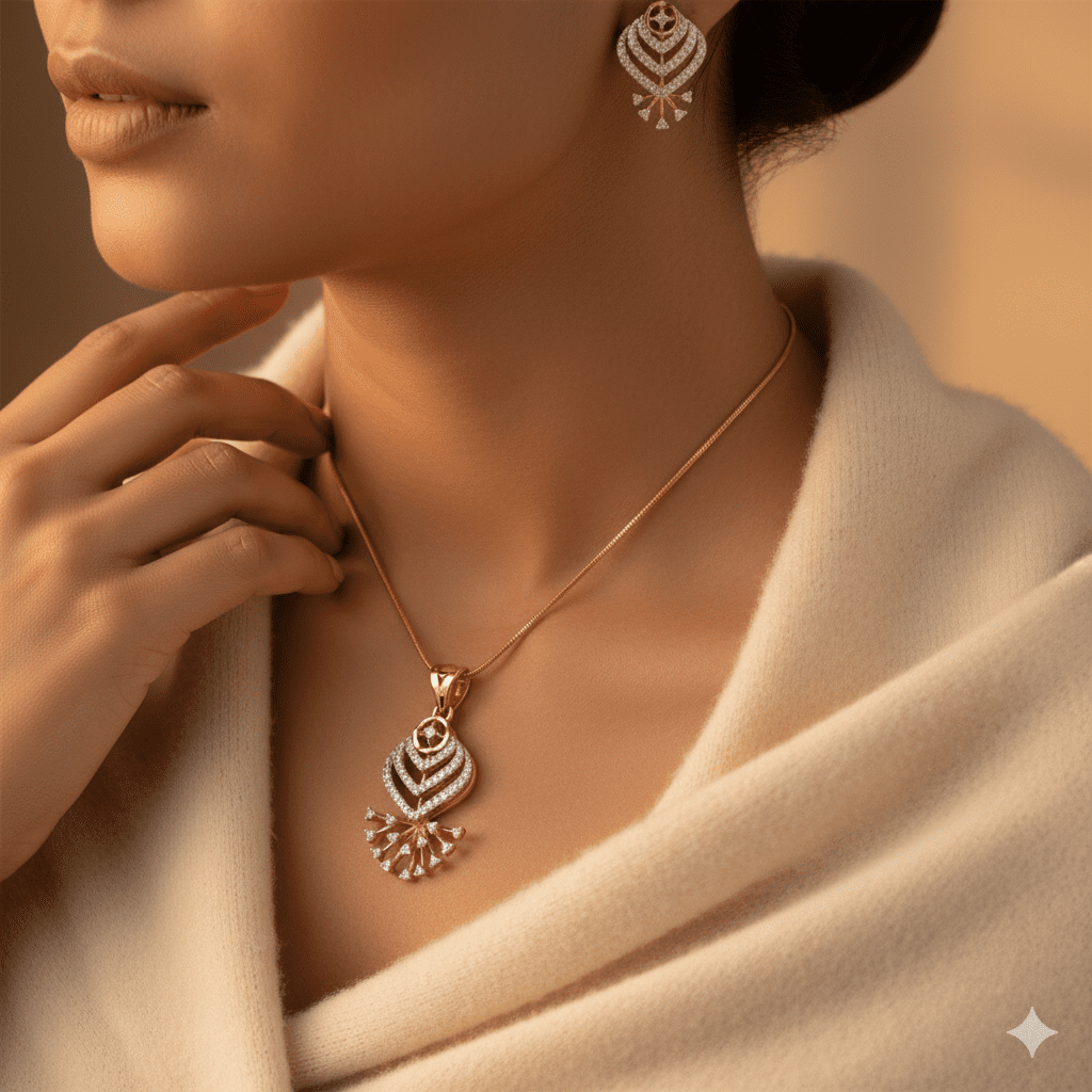 The “Chevron Sunburst” pendant and earring set showcases exceptional craftsmanship with its distinctive art deco-inspired design. This luxurious set features a stunning pendant and matching earrings, each adorned with meticulously arranged premium diamonds in an elegant chevron pattern topped with a radiant sunburst accent.