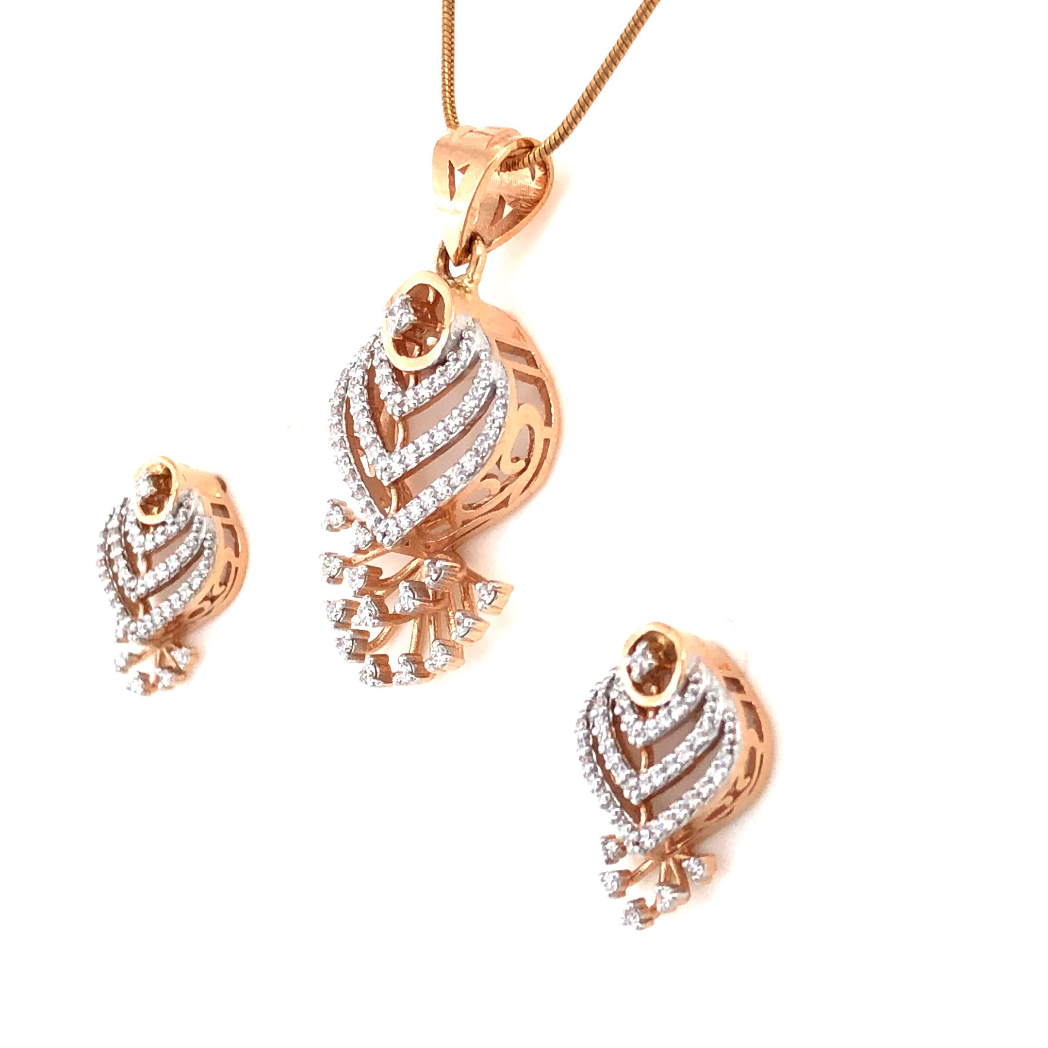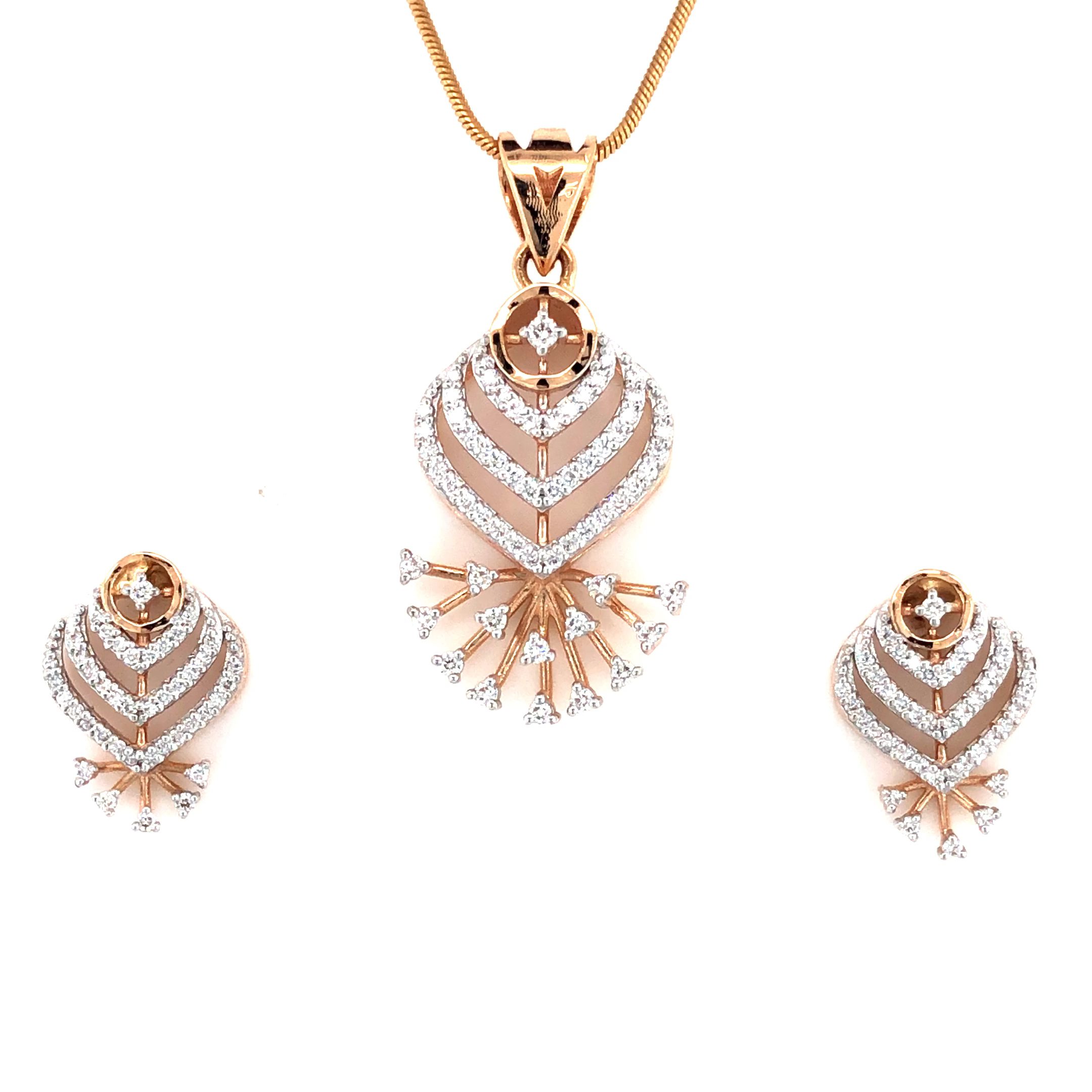 The pendant hangs beautifully from a delicate rose gold snake chain, while the perfectly proportioned earrings provide a balanced complement. The contrast between the warm 14K rose gold and the sparkling E+VS+ quality diamonds creates a sophisticated look that transitions effortlessly from day to evening wear, making this set perfect for both special occasions and everyday luxury.