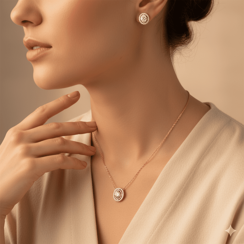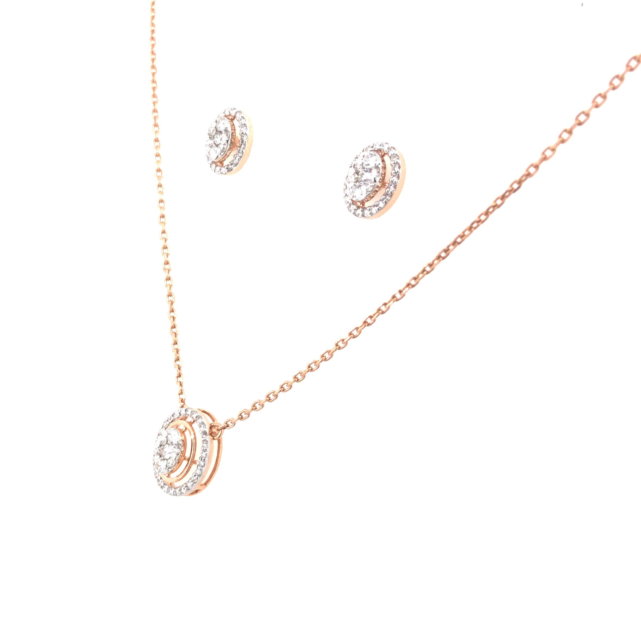 Indulge in timeless elegance with this meticulously crafted EF-VVS certified diamond jewellery set, featuring a radiant pendant with chain and a pair of finely designed earrings. Made in 14K hallmarked rose gold, the set blends modern sophistication with classic charm. The pendant showcases 33 natural diamonds with a total carat weight of 0.29 ct, exuding understated brilliance. Complementing it perfectly, the earrings are adorned with 54 real EF-VVS diamonds, totalling 0.45 ct, offering unmatched sparkle and finesse. Every piece is thoughtfully designed to reflect pure luxury and everlasting beauty.