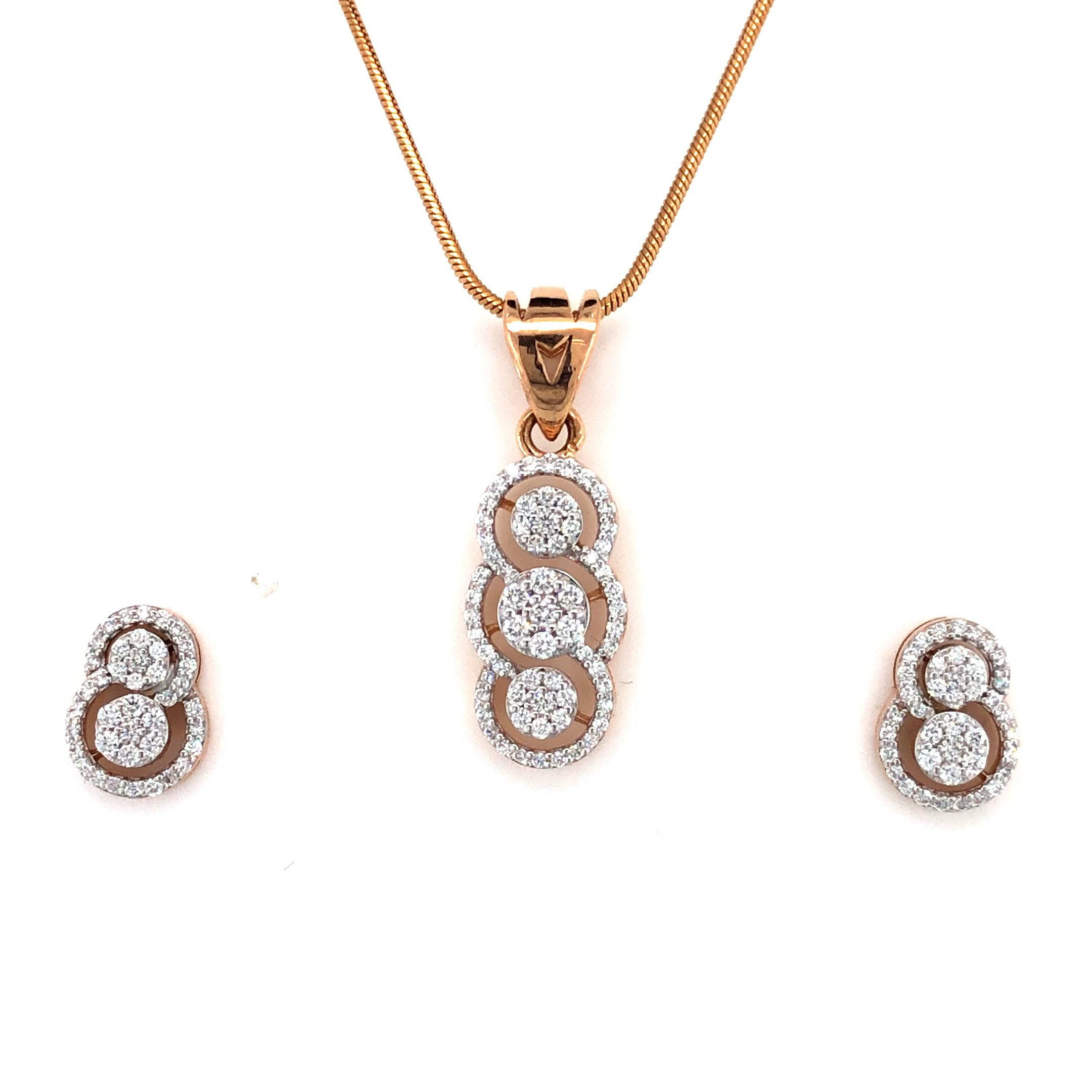 The pendant hangs beautifully from a delicate rose gold snake chain, while the perfectly proportioned earrings provide a balanced complement. The contrast between the warm 14K rose gold and the sparkling E+VS+ quality diamonds creates a sophisticated look that transitions effortlessly from day to evening wear, making this set perfect for both special occasions and everyday luxury.