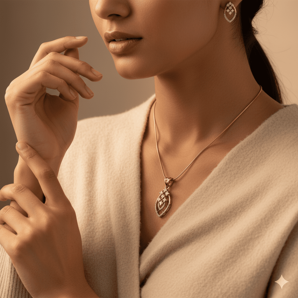 The thoughtful arrangement of 92 premium E+VS+ quality diamonds across the set creates a captivating play of light, with each stone strategically placed to enhance both the floral elements and the graceful marquise outline. The pendant hangs elegantly from a sleek rose gold snake chain through a simple bail that allows the marquise design to take center stage.