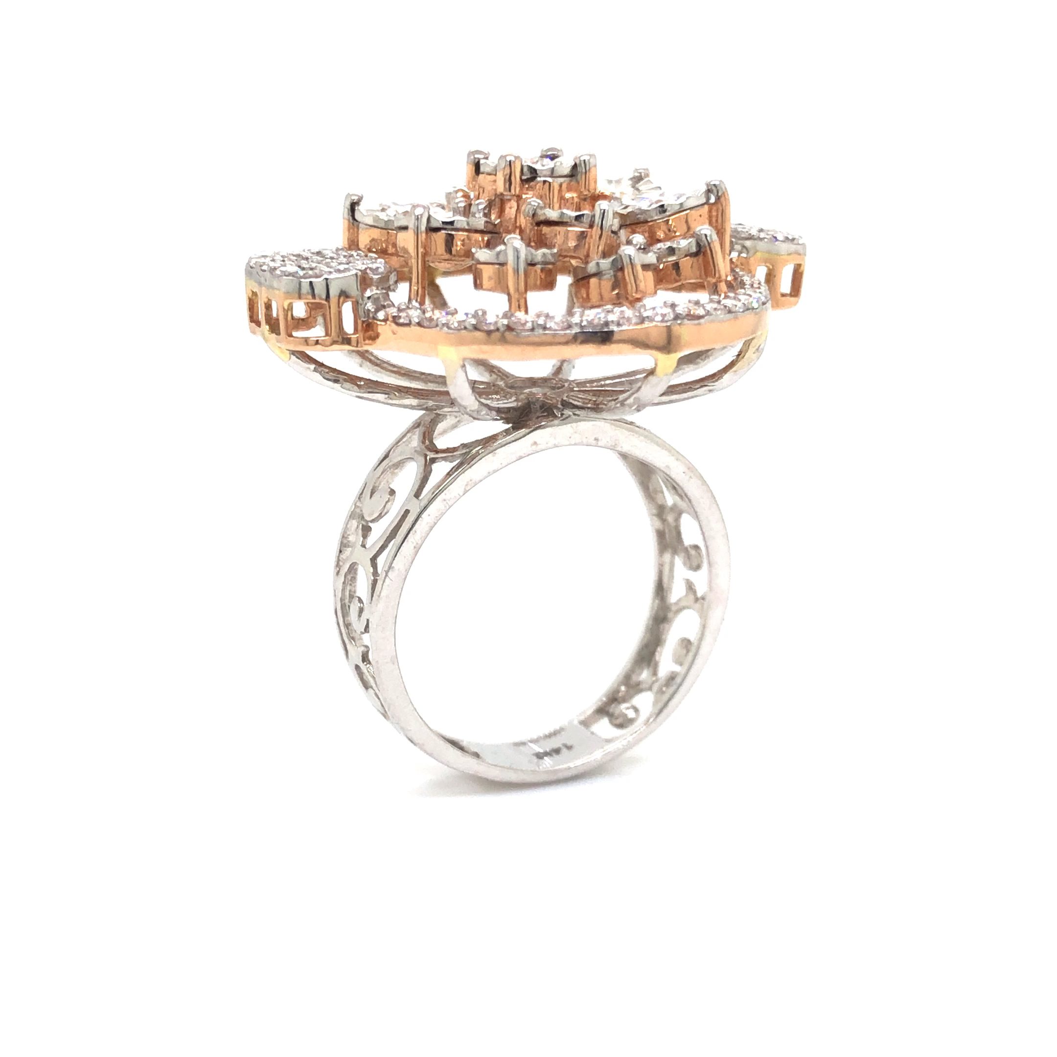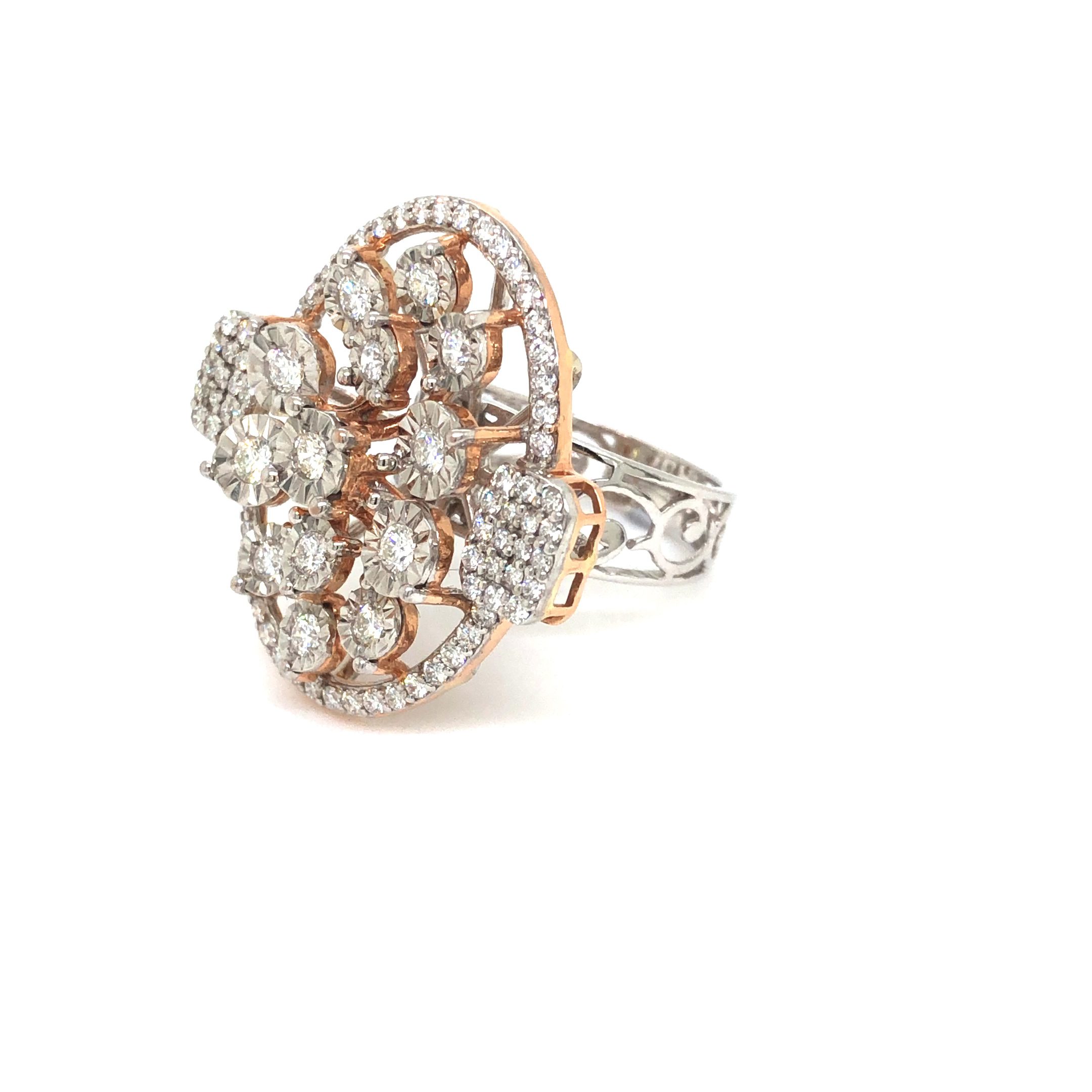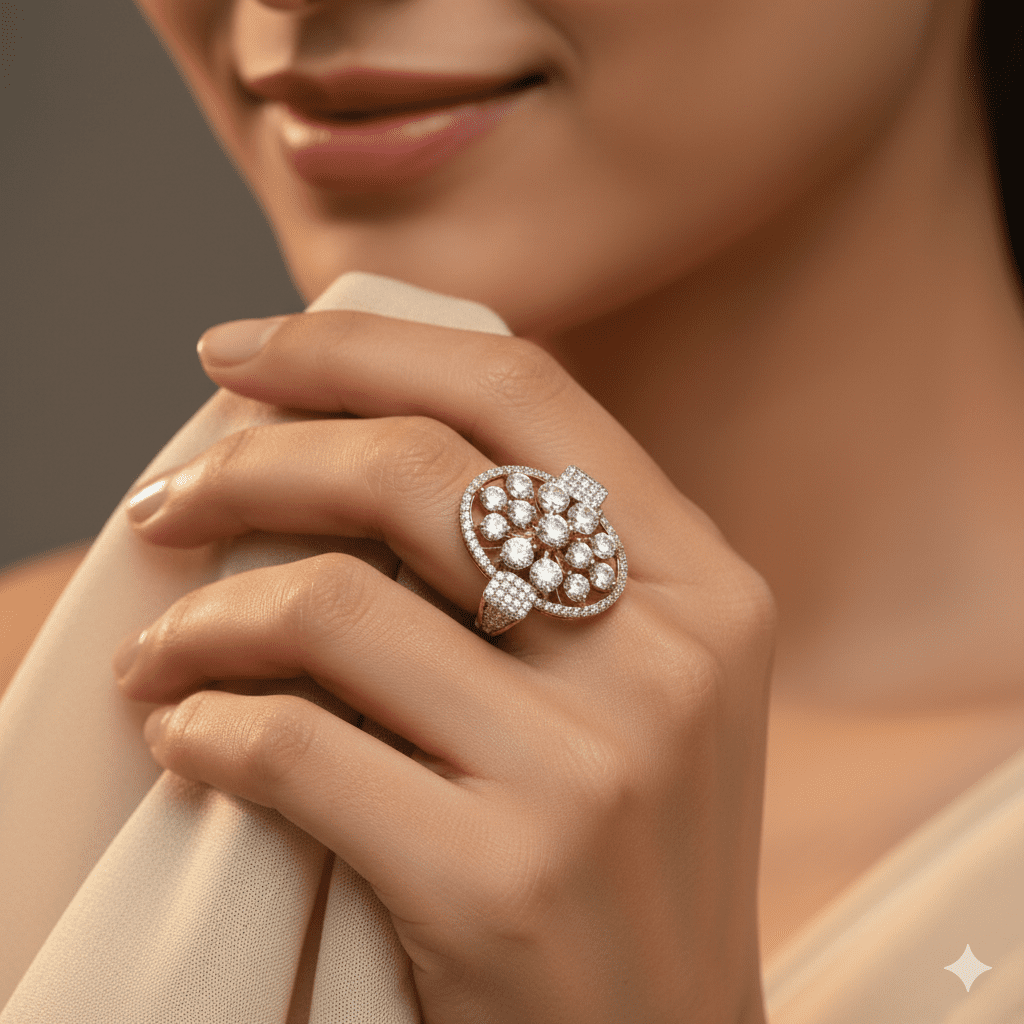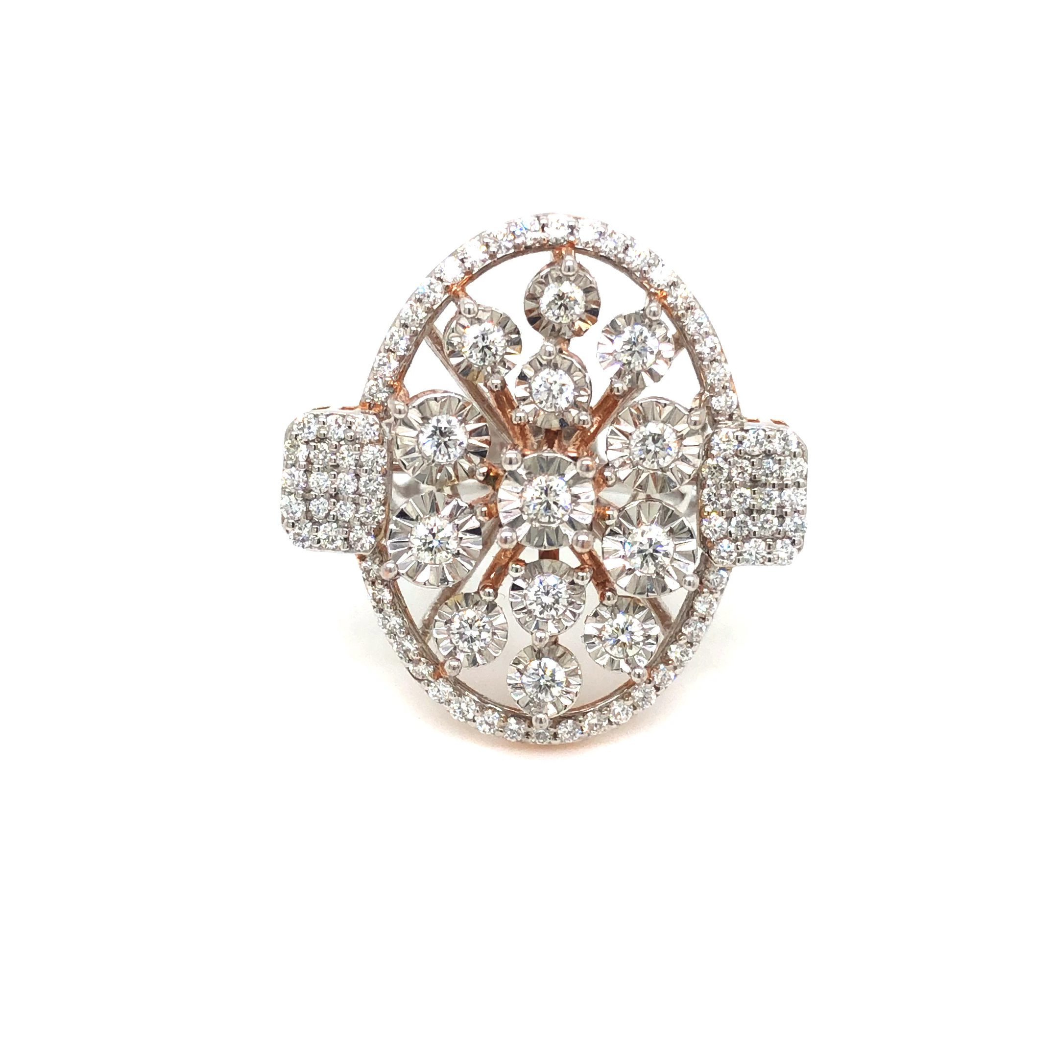 The “Oval Cluster” cocktail ring exemplifies opulent elegance with its spectacular design that showcases the artistry of fine jewelry craftsmanship. This magnificent statement piece features a breathtaking arrangement of premium diamonds set in warm rose gold, creating a show-stopping effect that commands attention.